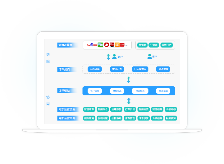 为企业提供全渠道整体解决方案,贯穿企业全链路,打通线上线下业务及供应链、进销存一体化